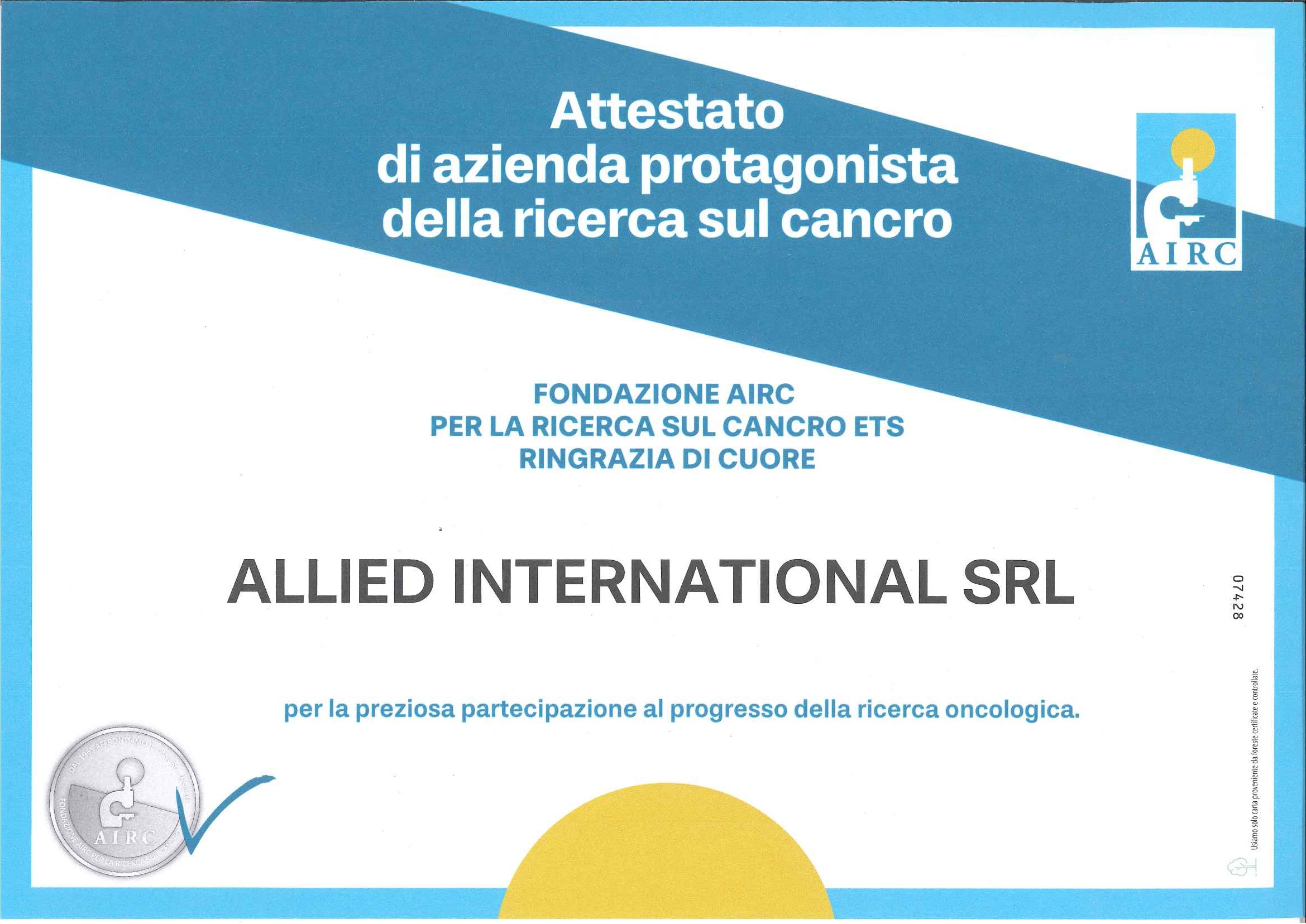 The AIRC Foundation has awarded the company the certificate of "Corporate Champion of Cancer Research" in recognition of the long-standing support that Allied has provided to oncological research initiatives.